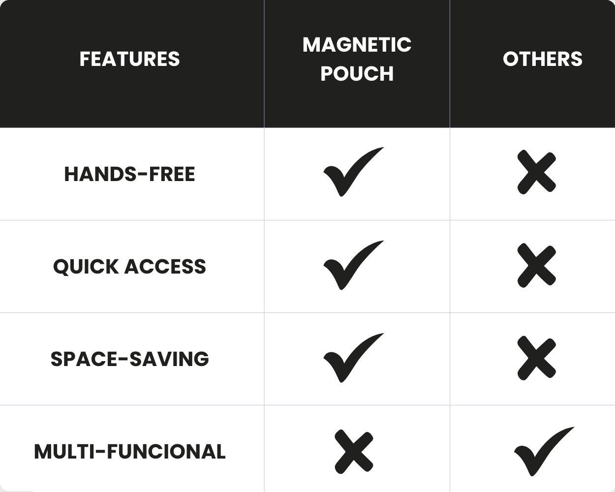 The pouch's secure magnetic attachment is facilitated by a robust magnetic backing, effortlessly adhering to magnetized surfaces. This guarantees your bag remains firmly in place, safeguarding your belongings while you concentrate on your activities.